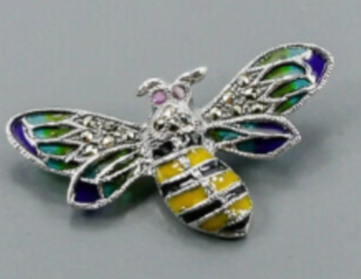 Solid Sterling Silver, Enamel Bee Pin Brooch with Genuine Ruby Eyes & Marsacasite Accent Stones